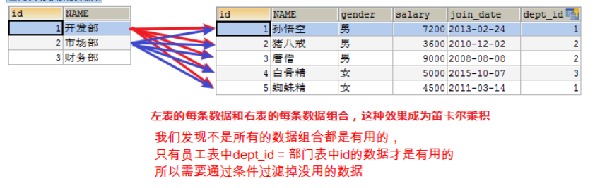 我们发现不是所有的数据组合都是有用的,只有员工表.dept_id = 部门表.id 的数据才是有用的。所以需要通过条件过滤掉没用的数据。