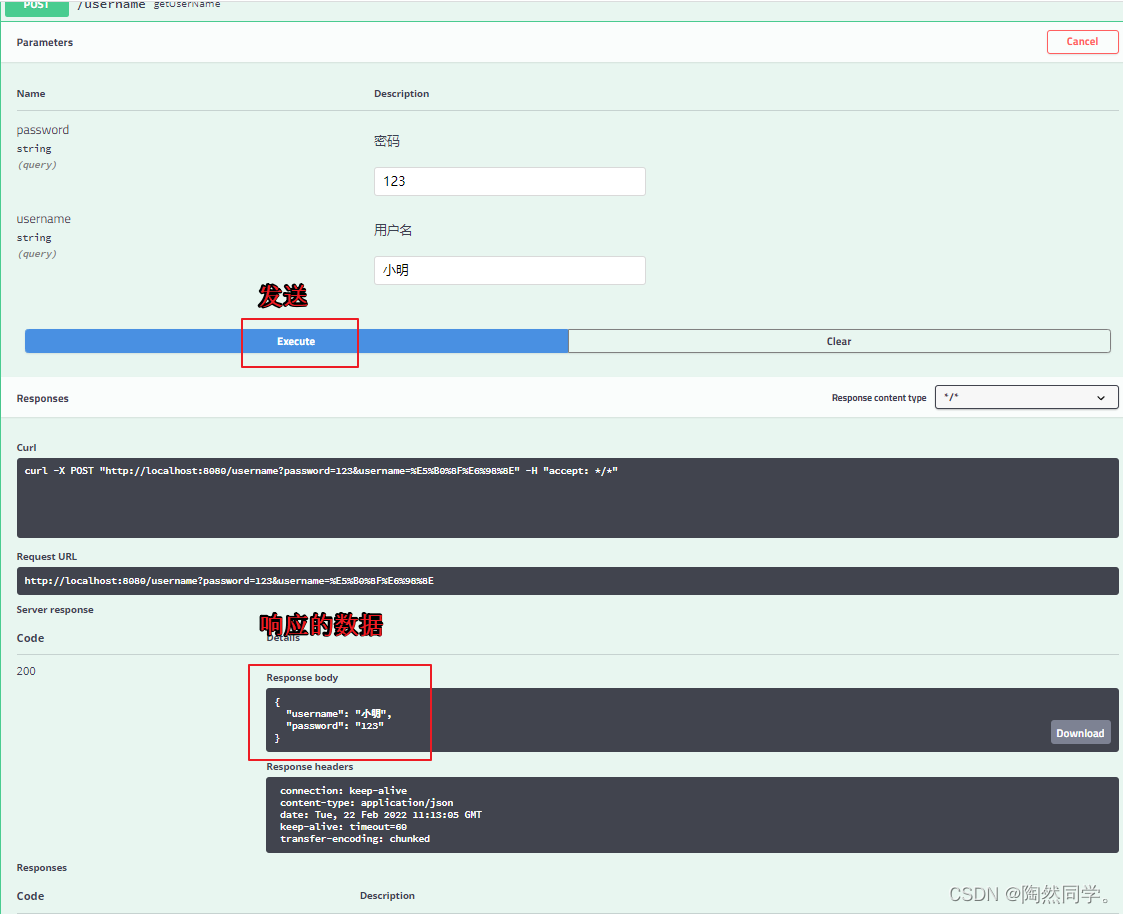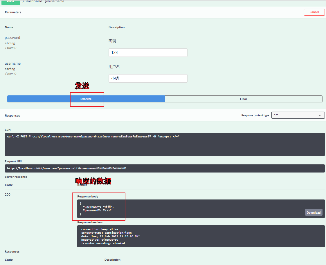 点击try it out 填写用户名 和 密码 再点击Execute发送 下面就能看到返回的结果