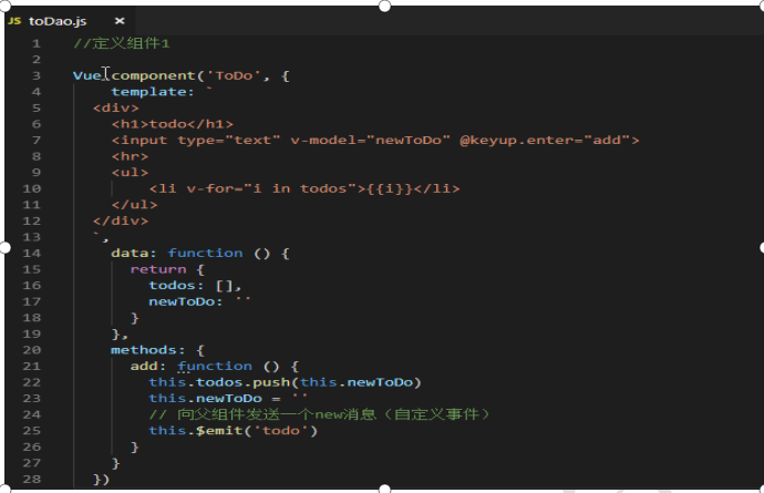 - 在组件中我们可以使用 emit 触发一个事件,这个事件的名字是我们自己定义的:
