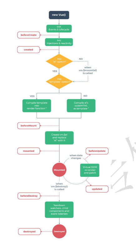 - 完整过程包含: 开始创建、初始化数据、编译模板、挂载Dom、渲染→更新→渲染、销毁