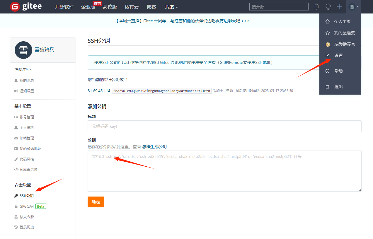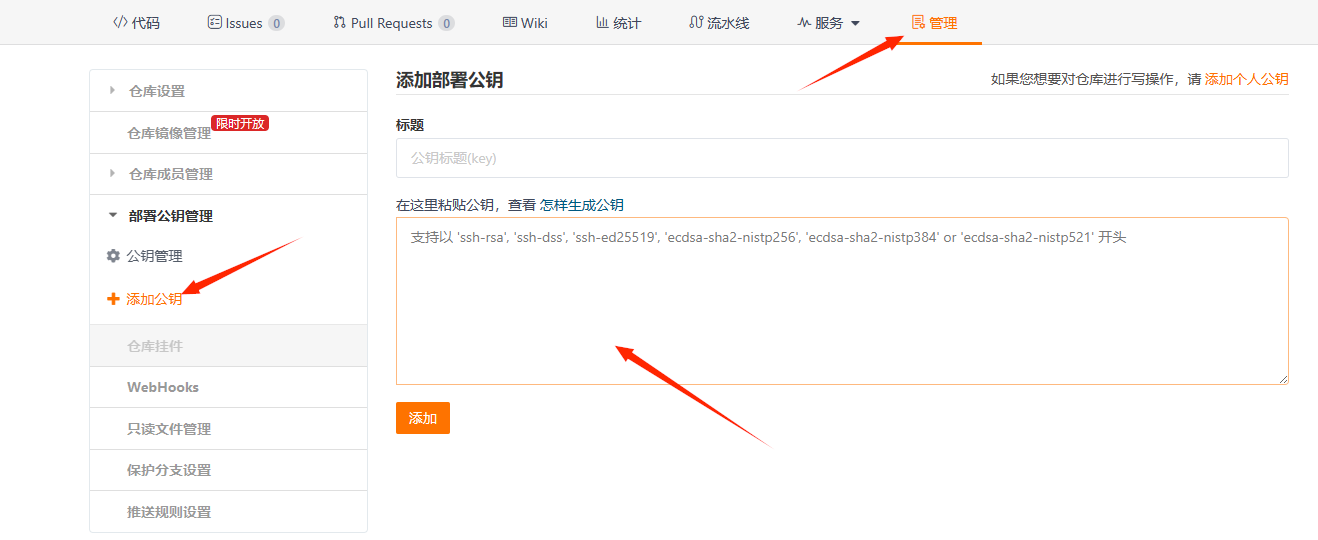 复制生成后的 ssh key,通过仓库主页 「管理」->「部署公钥管理」->「添加部署公钥」 ,添加生成的 public key 添加到仓库中。
