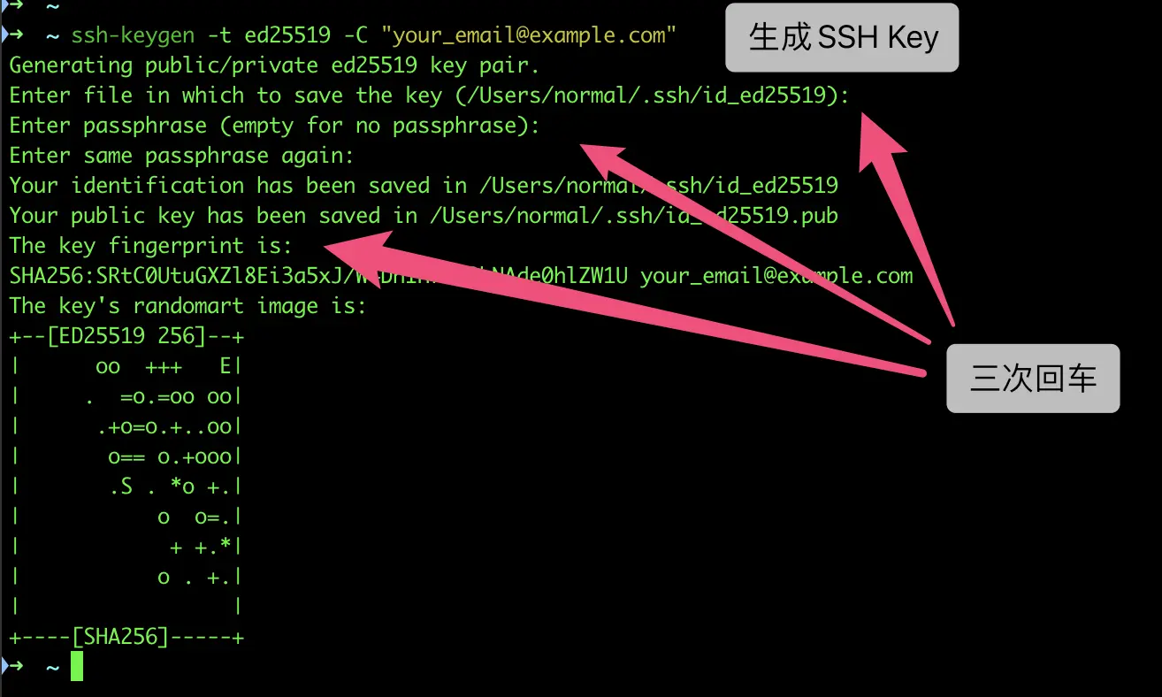 按照提示完成三次回车,即可生成 ssh key。通过查看 ~/.ssh/id_ed25519.pub