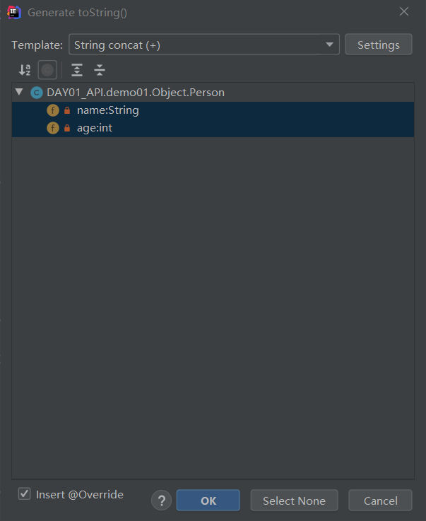 在IntelliJ IDEA中,可以点击Code菜单中的Generate...,也可以使用快捷键alt+insert,点击toString()选项。选择需要包含的成员变量并确定。如下图所示: