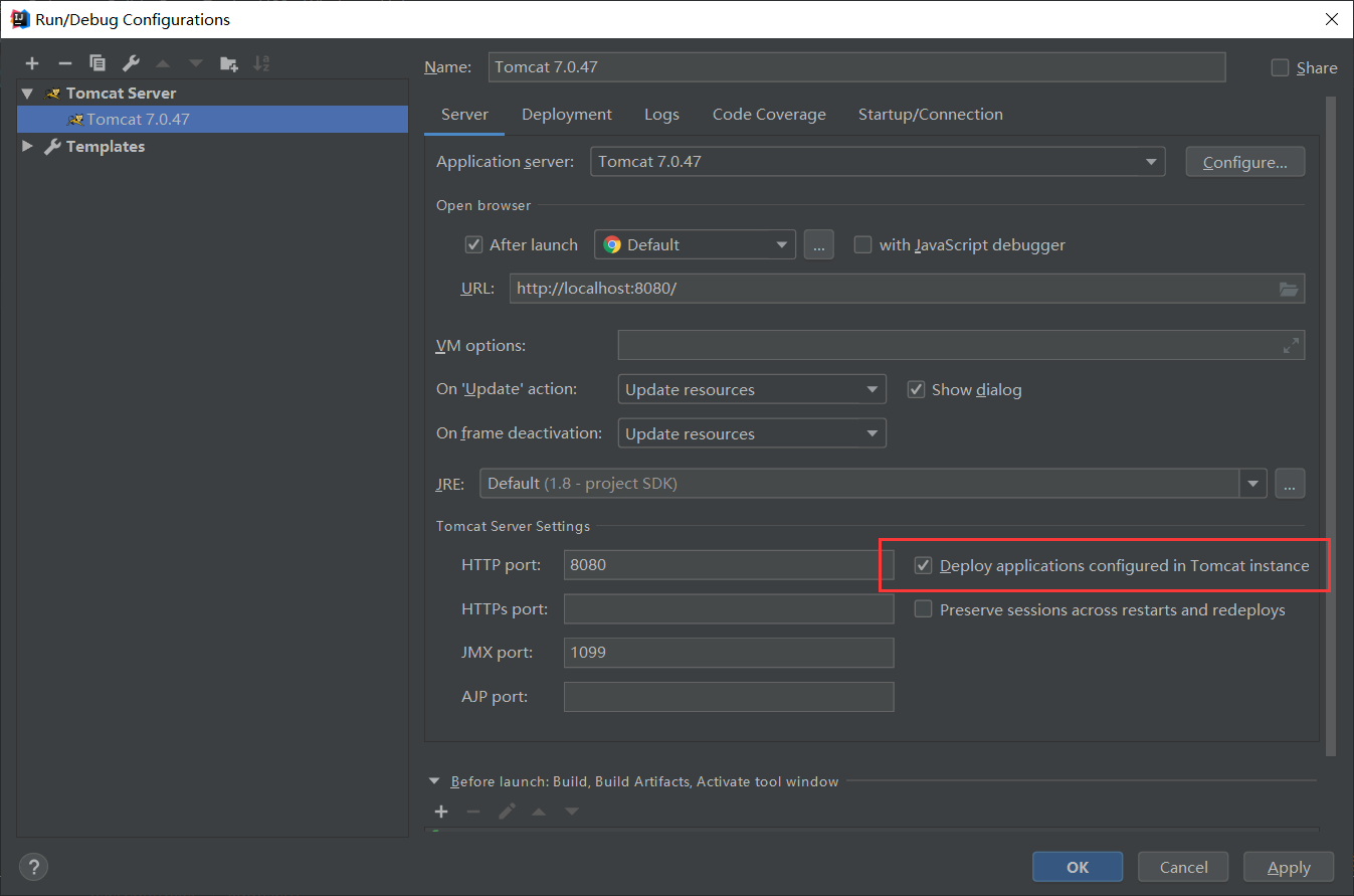2.打开你项目的Tomcat运行项目的配置 ,将红框处的选项勾选(用来解决可能出现的中文乱码的问题)如果没有出现中文乱码就不需要勾选了。