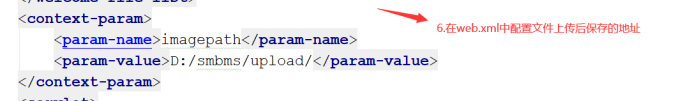 <!--文件上传--> <context-param> <param-name>imagepath</param-name> <param-value>D:/smbms/upload</param-value> </context-param>