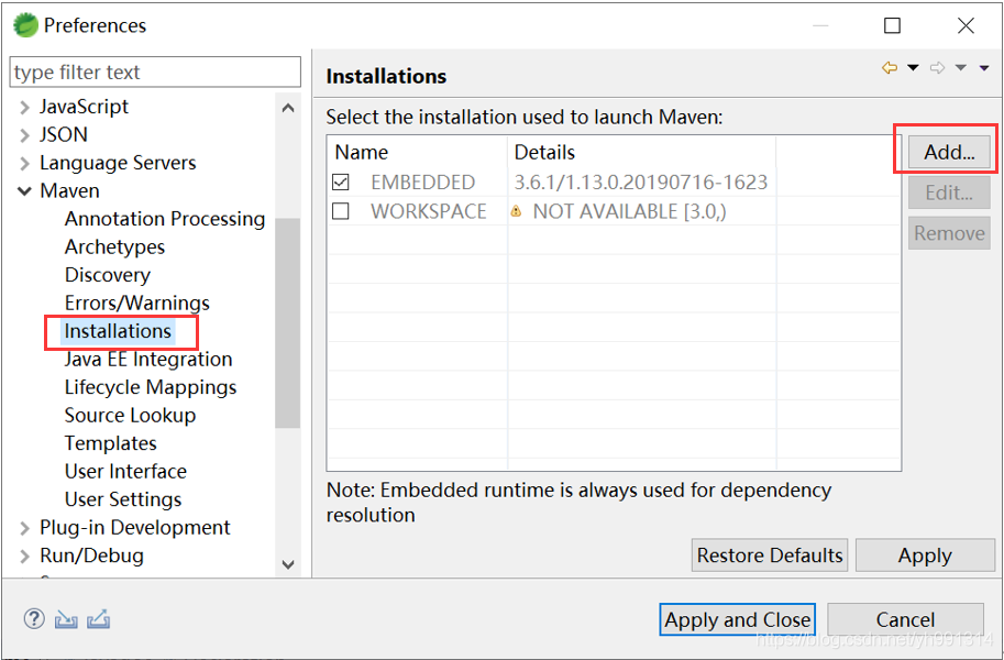1、点击Eclipse中的window->Preferences,找到Maven点击Installations选项。