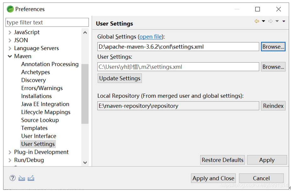 添加 Global Settings 目录,该目录要选择Maven安装文件里的conf文件夹下的 settings.xml 文件,紧接着我们点击 Update Settings 你会发现 Local Repository 下面的路径变成了我们修改后的也就是 maven本地仓库 的位置,然后我们点击 Apply 即可。