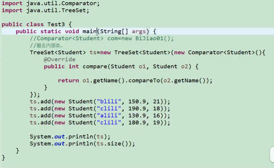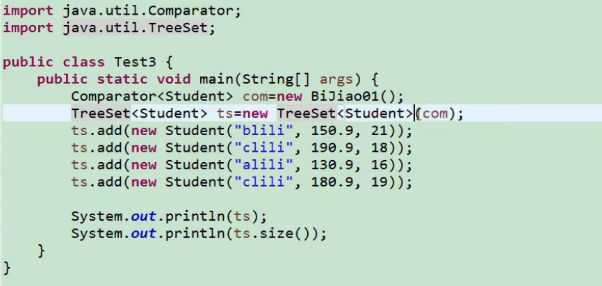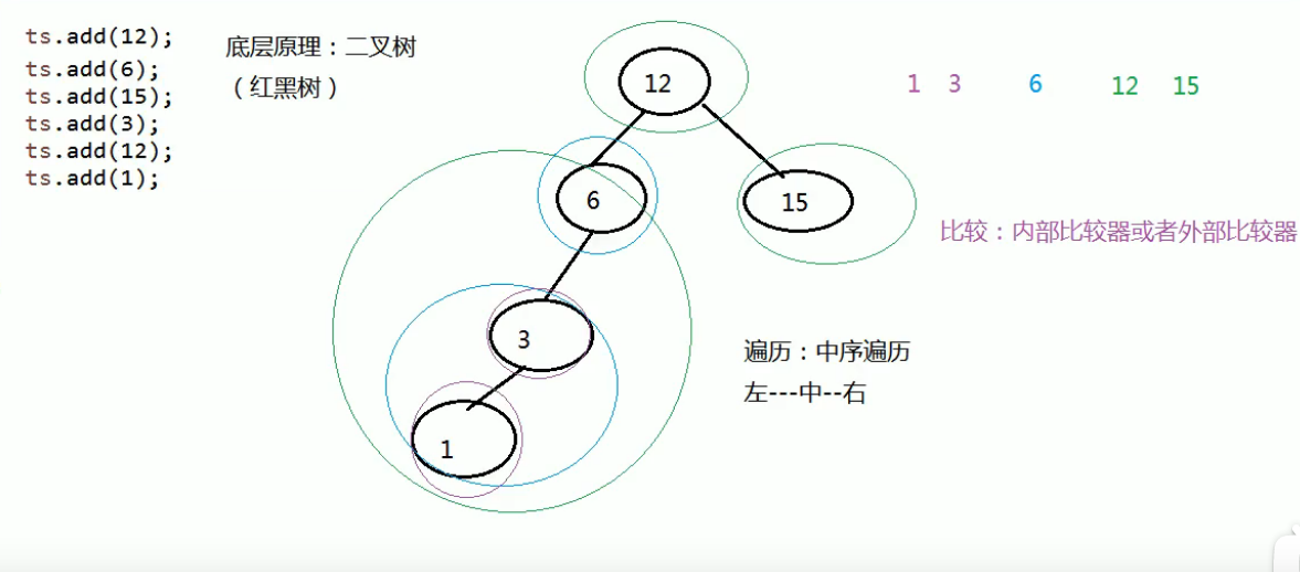 TreeSet 底层原理:二叉树(红黑树);自定义的类放入集合中,要实现内部比较器或者外部比较器