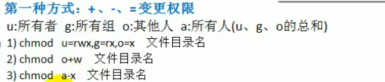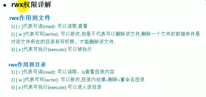3.第三个位置表示文件所在组的权限:r表示读权限;w表示写(修改、在目录内可以创建、删除、重命名)权限;x表示进入该目录权限;-表示没有权限;