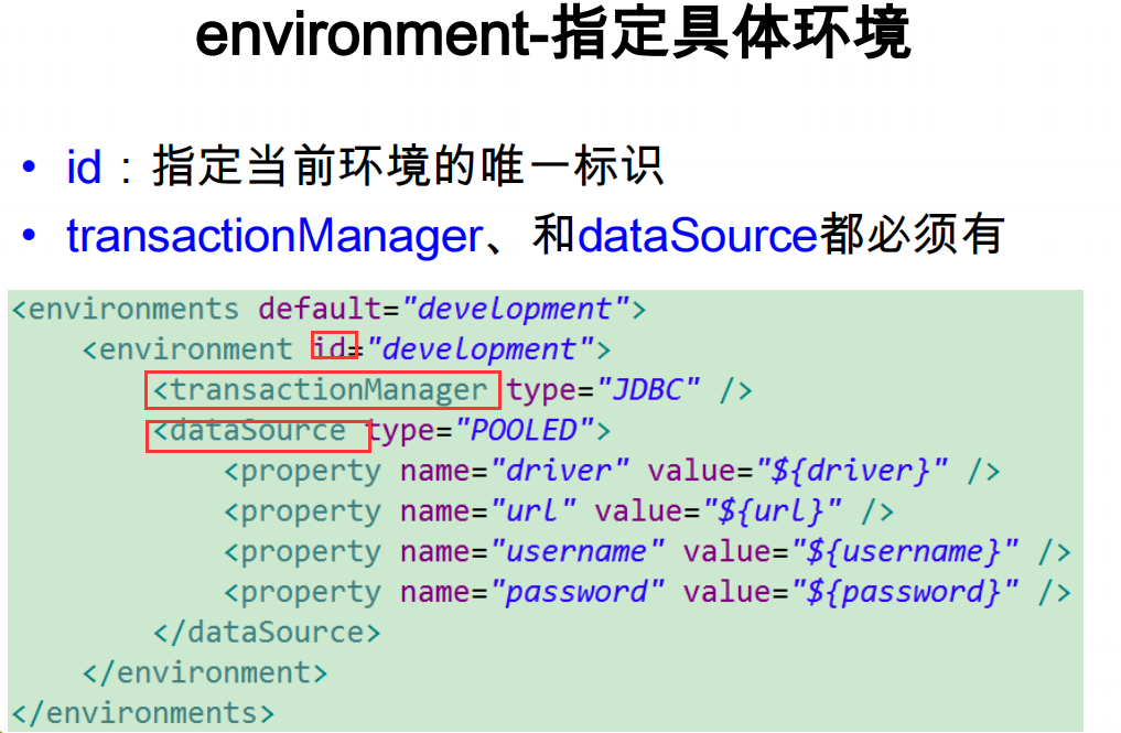 每种环境使用一个environment标签进行配置并指定唯一标识符