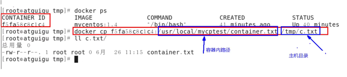 ⑥从容器内拷贝文件到主机上:docker cp 容器id:容器内路径 目的主机路径