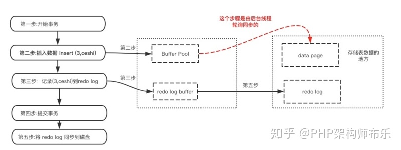 因此,redo log派上了用场。在事务执行语句过程中,数据写入Buffer Pool,然后记录写入redo log buffer里,当事务提交时,会对redo log buffer进行刷盘,记录到redo log file中(同步到磁盘中)。然后在某一个时间,数据由Buffer Pool写入到磁盘中。具体执行过程见下图。