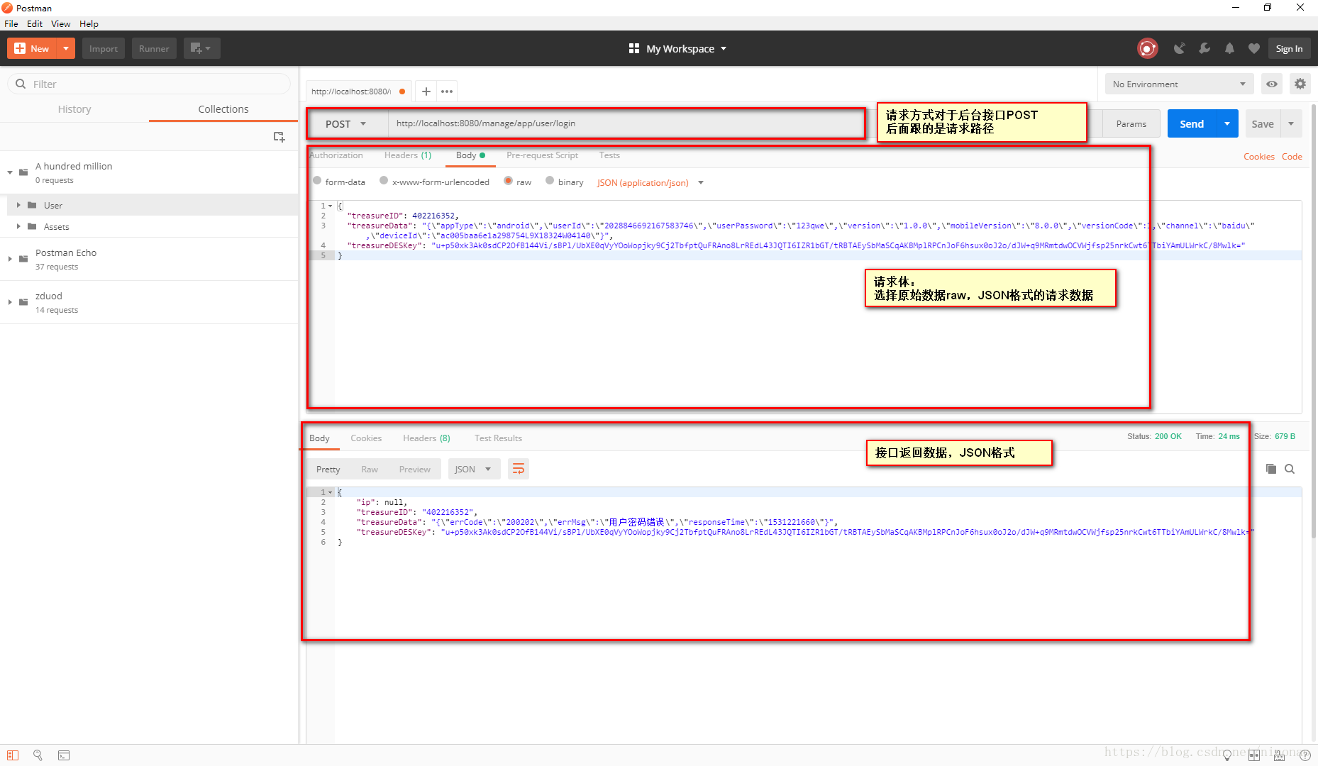 1、在图2-6所示第一部分填写接口请求路径,左侧下拉列表可选择请求方式,此处选择POST请求方式。接口请求路径为http://localhost:8080/manage/app/user/login