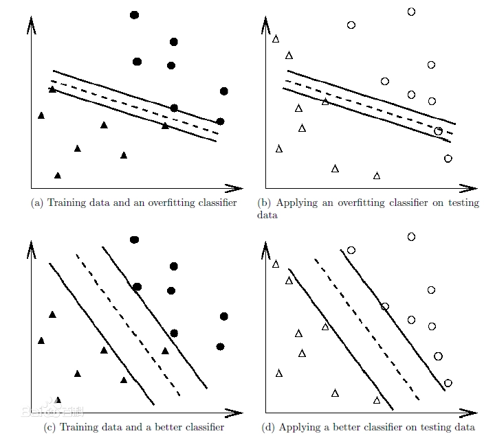 图解:可以看出在a中虽然完全的拟合了样本数据,但对于b中的测试数据分类准确度很差。而c虽然没有完全拟合样本数据,但在d中对于测试数据的分类准确度却很高。