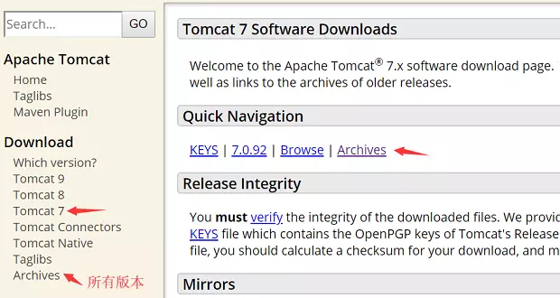 中选择对应tomcat主版本,然后点击右侧的Archives