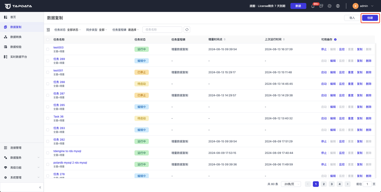 - 左侧导航栏点击数据复制,并点击右侧创建: