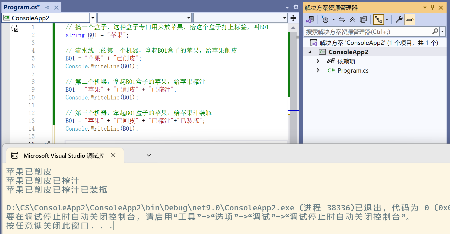 括号:Console.WriteLine()就是流水线的其中一个机器,括号()就像是机器的大钳子,夹起流水线上的物品,处理完成后再放到流水线上。