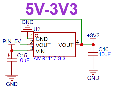 除此之外,通用的5V转3.3V设计用标准库的AMS1117-3.3,这个非常便宜,但注意VIN和VOUT都要接带有极性的钽电容为佳,刚好标准库里有一个10uF电容,直接接到输入输出端。