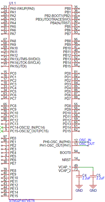 STM32还有两个接电容的引脚VCAP_1及VCAP_2,为了保证内部主调压器的电压稳定,选择不当可能会引起程序无法下载或者运行不稳定的情况。数据手册里也给出这个电容的相关参考参数。我们这里选取2.2uF