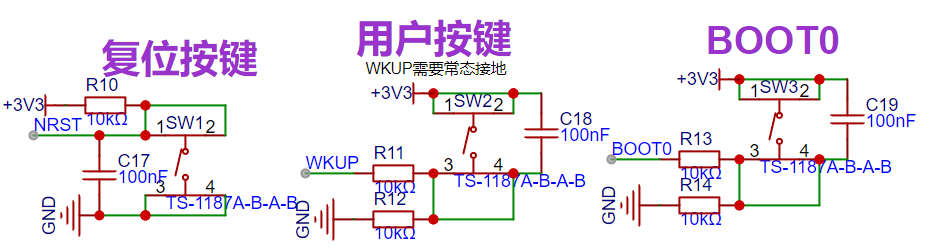 按键电路主要分为平时拉低的和平时拉高的,尤其是复位按键、唤醒按键和BOOT0或1按键这种特殊电位的按键。其中复位按键一般拉高,用户(唤醒)按键及BOOT0一般拉低