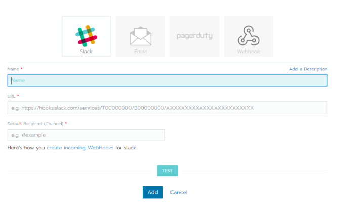 您选择其中一个选项后,接着就需要填写与此选项相关的各种配置参数。比如在下图的Slack示例中,您可以看到有一个链接显示了如何配置通知程序。