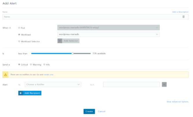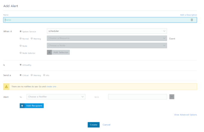 如你所见,您可以设置各种告警相关的选项,这些选项将会与系统或用户资源关联起来。在集群级别,您可以根据集群范围的资源(例如Node或实际的Kubernetes组件)设置告警。