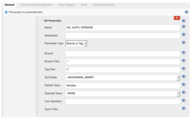 序列中的第一个任务将会在每次提交后从源码控制中检出最新的代码并且确保其可编译。它还会运行单元测试。如果要在我们的示例项目中设置第一个任务,选择New Item->Freestyle Project。进入项目配置视图中,选择General选项卡以及“The project is parameterized”选项。添加一个叫做GO_AUTH_VERSION的git参数,将参数类型设置为Branch(分支)或者Tag(标记)。接下来选择Advanced配置参数,使用Tag Filter设置获取匹配“v”的所有标记(比如v2.0)。将Default Value设置成develop(开发分支)。这将有助于从Git获取版本标签列表,并为该任务填充选项菜单。如果该任务要在没有给定值的情况下自动触发,那么GO_AUTH_VERSION默认设成develop(开发)分支。