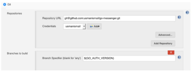 接下来,在Source Code Management选项卡部分添加仓库url,指定分支为${GO_AUTH_VERSION},这样手动构建时将会使用git参数来选择分支或标记进行构建及设置轮询间隔。这样一来,Jenkins就会持续追踪我们开发分支的未来所有更改,在我们的CI(和CD)流水线中自动触发第一个任务。这里要注意的是,GO_AUTH_VERSION的默认值(比如开发分支)将用于自动检测到的更改。
