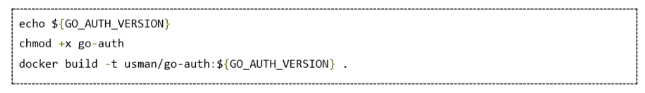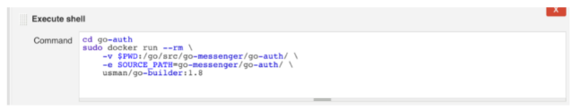 和之前一样,添加构建步骤来执行shell。注意这里你不需要指定SCM设置,因为我们将从前一个构建生成的工件中提取所需的二进制文件和脚本。注意一下,我们这里是先创建未标记的usman/go-auth,之后再重新标记,这样我们就可以在后面执行集成测试,搭建好未打标记的容器环境。