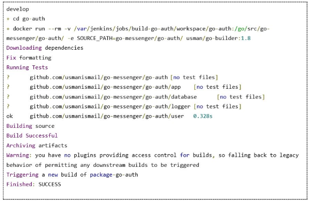 构建任务的日志输出应该像下面展示的这样。你可以看到我们使用了docker化的容器来执行构建。构建时将使用go fmt来修复代码中任何格式的不一致,并且执行我们的单元测试。如果出现测试失败或者编译不通过,Jenkins就会检测到失败。此外,你应该通过email或者chat integrations(例如Hipchat或者Slack)设置通知,这样在构建失败时就能通知到你的团队,快速地修复它。