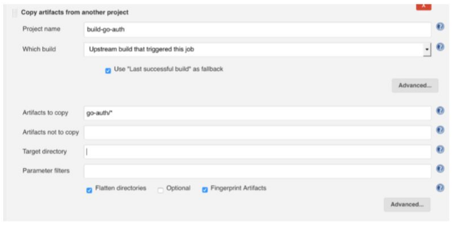 接着我们使用Trigger parameterized builds(触发器参数化构建)启动流水线中的下一个任务,如下图所示。在添加Trigger parameterized build时,请确保是从Add Parameters中添加的Current build parameters。这样可以让当前任务的全部参数(比如GO_AUTH_VERSION)用于下一个任务。请留意在Trigger parameterized build部分中用于下游任务的参数名称,我们将在下面的步骤中用到。