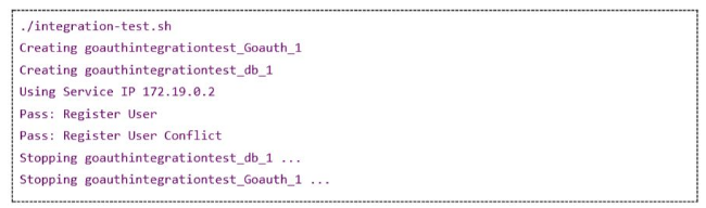 脚本的内容可以在这里找到:https://github.com/usmanismail/go-messenger/blob/master/go-auth/integration-test.sh。我们用Docker Compose搭建我们的环境,然后使用curl发送http请求到搭建的容器中。这项任务的日志将会和下图显示的相似。Compose将会启动一个数据库容器,并将它连接到goauth容器。数据库连接之后你应该会看到一些列“Pass: …”信息,说明各项测试都在运行和验证。测试完成后,compose模板将会自行清理数据库和go-auth容器。