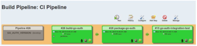 当你更改开发分支时,你会注意到流水线是由Jenkins自动触发的。如果要手动触发流水线,选择你第一个(构建)任务,运行它。系统会要求你选择git参数的值(比如GO_AUTH_VERSION)。不指定的话会执行默认值,并且会运行针对开发分支中最新内容的CI流水线。当然,你可以直接在流水线视图中单击“Run”。