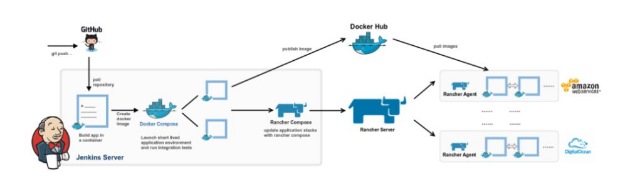 我们在多主机环境中使用的是Rancher Compose启动环境,这样更贴近生产环境,允许我们测试和各种服务的集成,例如Rancher和Docker Hub等等。和我们之前不同,我们以前基于Docker Compose的环境是明确设计成独立于外部服务,在CI服务器本身上启动的,无需将镜像推送到dockerhub。