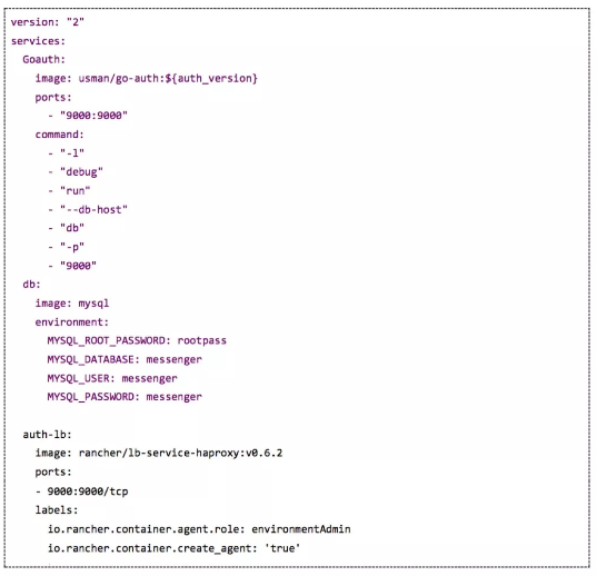 在上篇文章中,我们创建了一个Docker Compose模板定义我们的项目所需的容器类型。Compose模板(docker-compose.yml)如下图所示。现在我们将使用与之前相同的Docker Compose模板,不过增加了auth-lb服务。这会在我们的go-auth服务前添加一个负载均衡器,并将所有运行该服务的容器的流量分开。在服务前添加一个负载均衡器对于确保可用性和扩展性来说至关重要,因为即使一个(或多个)服务容器死亡,它依然能够提供流量。另外,它还能将负载扩展到多个容器上,这些容器可能在多个主机上运行。我在本文中使用的Rancher旧版本不支持3版本的compose文件,因此我们必须要设置版本为2,删除错误的环境变量,修正go-auth的版本。