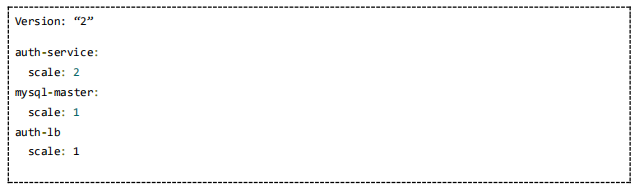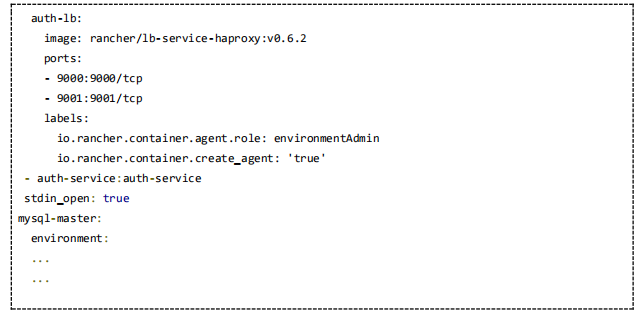 现在我们使用Rancher Compose启动一个多主机测试环境来代替Docker Compose,我们还需要定义一个rancher compose模板。创建一个叫做rancher-compose.yml的文件,添加以下内容。在这个文件中,我们定义了两个需要用到auth-service的容器、一个运行数据库的容器以及另一个运行负载均衡器的容器。