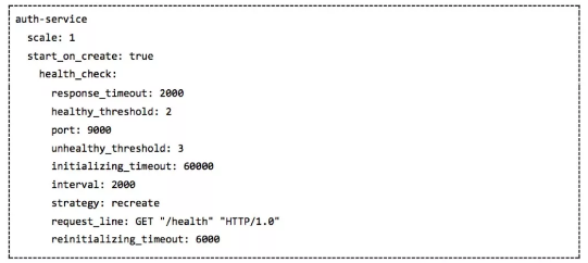 我们现在给每2秒(2000毫秒)运行的服务容器的9000端口定义一个健康检查。该检查会向/health URL发出http请求,连续3次检查失败会将容器标记为不健康,而2次成功则标记为健康。