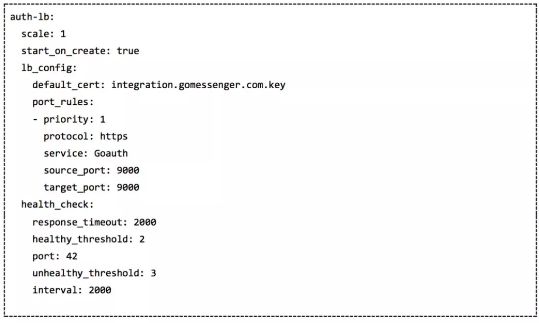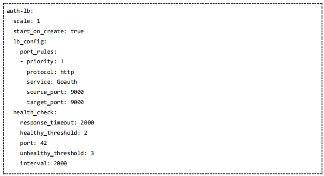 同样,我们需要将lb_config部分添加到负载均衡器rancher-compose.yml文件中,让它知道针对哪个服务(GoAuth),需要公开哪些端口,以及如何验证负载均衡器之后实例的健康情况。rancher-compose.yml文件的auth-lb部分应该如下所示: