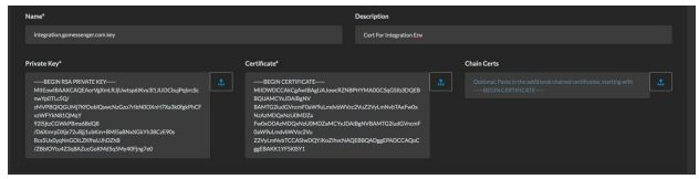 现在你已经拥有了证书和私钥文件,下面需要讲这些文件上传到Rancher中。我们可以在Rancher UI的Infrastructure选项卡,单击Certificates部分的Add Certificate按钮上传证书。你还需要给你的证书起一个有意义的名称,填写描述。接着分别在Private Key和Certificate字段复制粘贴integration.gomessenger.com.key和integration.gomessenger.com.crt的内容(或者选择Read from File从文件读取)。在完成了表单后,点击保存,等待片刻证书便生效了。