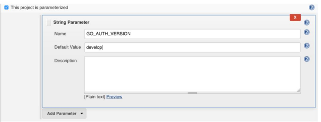 因为这是我们对前一章中构建的流水线的后续,因此该作业会有和go-auth-integration-test作业类似的配置。你需要首先设置的是parameterized build并且添加GO_AUTH_VERSION变量。