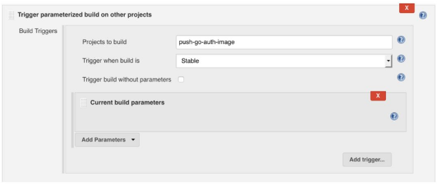 现在我们需要确保这个作业是在集成测试作业之后才触发的。要做到这一点,我们需要更新集成测试作业,以便使用当前的构建参数触发参数化构建。这意味着在每次成功运行集成测试作业后,我们会把测试好的镜像push到DockerHub上。