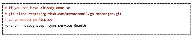我们可以使用最简单的方法——停止所有服务(auth服务、负载均衡器以及mysql),提取最新的镜像并启动所有服务。然而,对于我们来说,我们只想更新应用程序,而并不想停止长时间运行的环境,这样就不太理想了。要更新我们的应用程序,我们首先要停止auth-service。你可以在Rancher Compose使用stop命令完成操作。