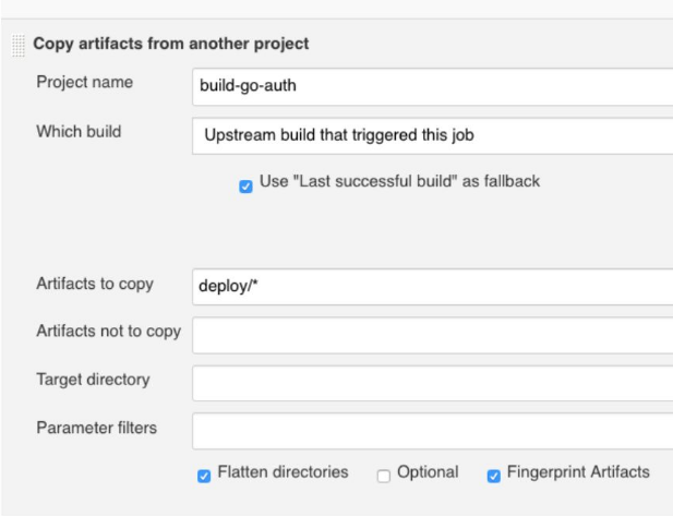 现在我们已经知道该如何运行我们的更新,我们在流水线中创建一个Jenkins作业来执行此操作。和之前一样,创建一个新的freestyle项目,命名为deploy-integration。与其他的作业一样,它也是一个参数化构建,用GO_AUTH_VERSION作为字符串参数。接下来,我们要从上游的build-go-auth作业中复制工件。