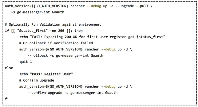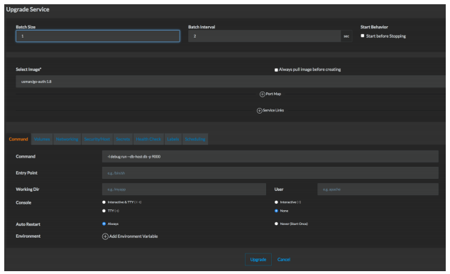 第一个策略称为就地更新(In-placeupdates),顾名思义,它的思想就是复用应用程序环境,并且就地更新应用程序。这有时也称作是滚动部署。我们将使用我们目前讨论的示例应用程序(go-auth)。此外,我们假定你有用Rancher运行的服务。如果要就地更新,你可以使用下面的升级命令:
