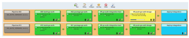 上一章提到,我们使用的是git-flow分支模型,其所有的功能分支都合并到“开发”分支中。为了能够不断地将发生的变更部署到集成环境中,我们需要一个简单的机制来生成基于开发分支的最新镜像。在打包过程中,我们使用GO_AUTH_VERSION来标记docker容器(例如,docker build -t usman/go-auth:${GO_AUTH_VERSION} ....)。在默认情况下,这个版本将会成为开发分支,但是本章后面我们将为我们的应用程序创建新发布,使用CI/CD流水线来构建、打包、测试,并把它们部署到我们的集成环境中。要注意的是,在这个方案中,我们总会覆盖我们开发分支的镜像(usman/go-auth:develop),这限制了我们引用历史构建以及执行回滚。你可以对流水线做一个简单的更改,把Jenkins构建编号添加到自身的版本名称上,比如usman/go-auth:develop-14。