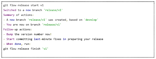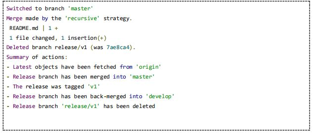 在我们将代码部署到持续的可测试环境中后,我们就会让QA团队测试对这些变更进行一段时间的测试。在他们确定代码已经就绪后,我们可以创建一个发布,随后将它部署到生产环境中。用git-flow发布的方式类似于特征分支(我们在前一章讨论过的工作方式),我们使用gitflow release start [Release Name]命令(如下所示)进行发布。这将创建一个新的名称来发布分支。在这个分支中,我们将执行一些内部的操作,比如增加版本号,做最后的修改。