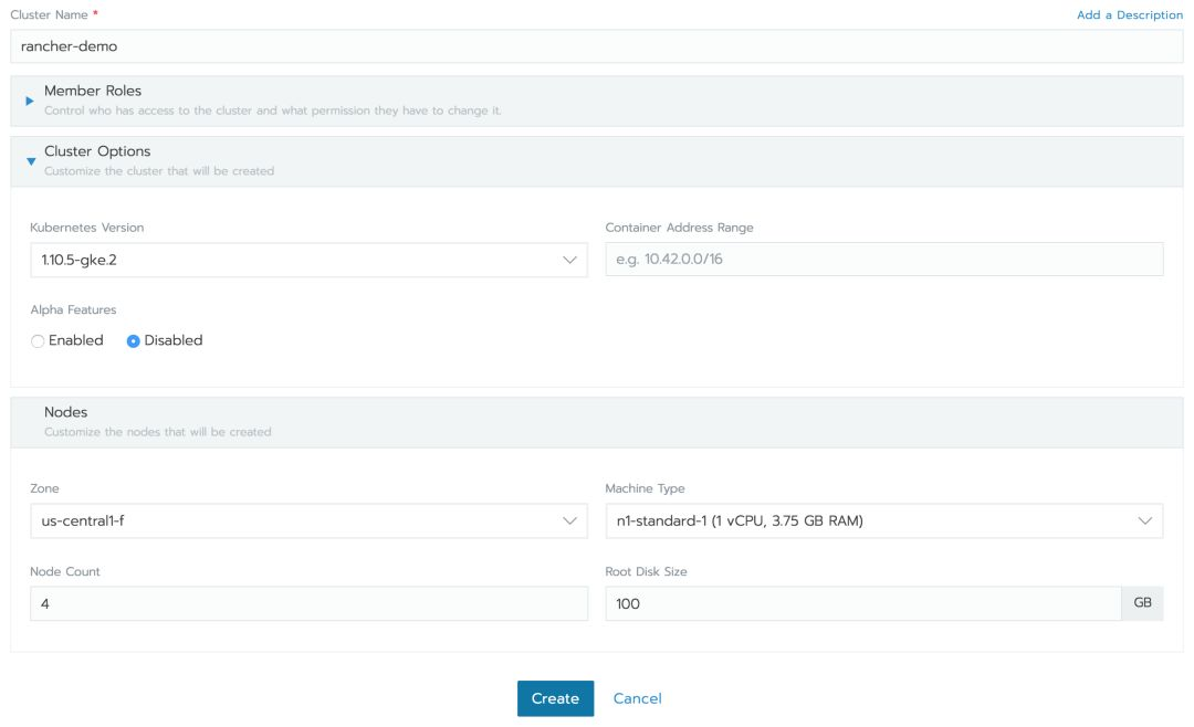 现在你可以用你的服务账户密钥来使用Rancher 2.0启动一个Kubernetes集群(使用默认的Compute Engine服务帐户是安全的):