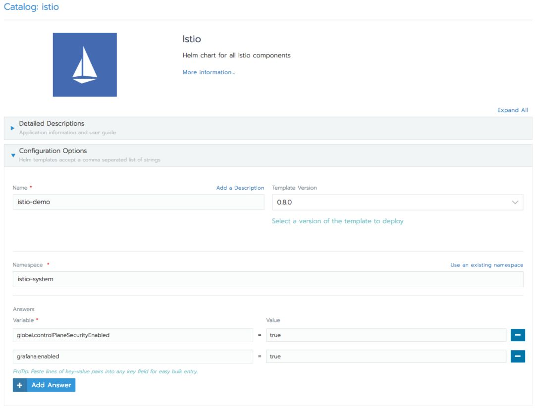 点击Add Answer,将global.controlPlaneSecurityEnabled和grafana.enabled的值设置为true。即可添加上述功能。