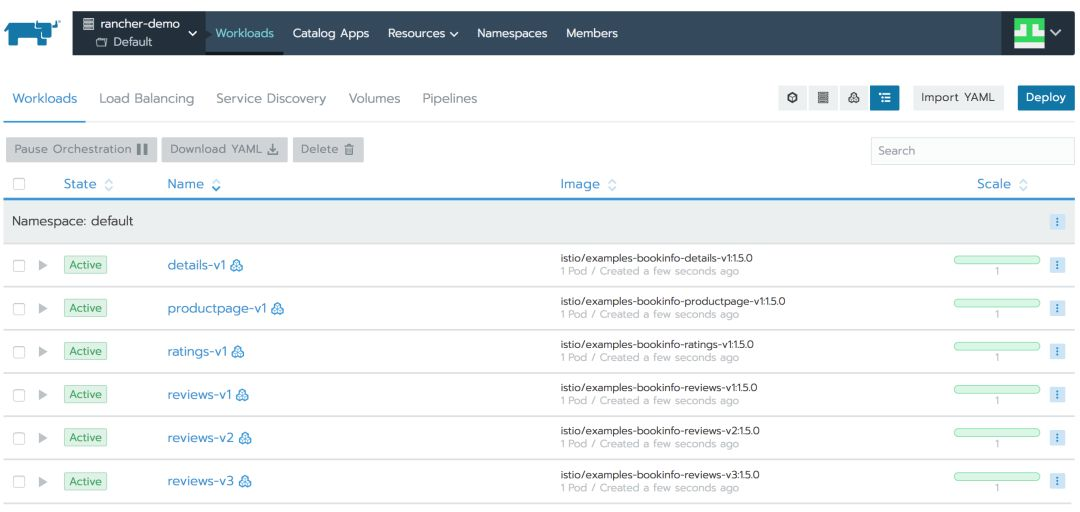 现在,你可以开始部署一个测试应用并且测试Istio的强大功能。首先,部署Bookinfo示例应用。这个应用有趣的部分在于它有三个版本的reviews程序同时运行。我们可-以在这三个版本的程序中体验到Istio的一些功能。接着,访问rancher-demo的默认项目中的工作负载来部署Bookinfo app,具体的操作是: