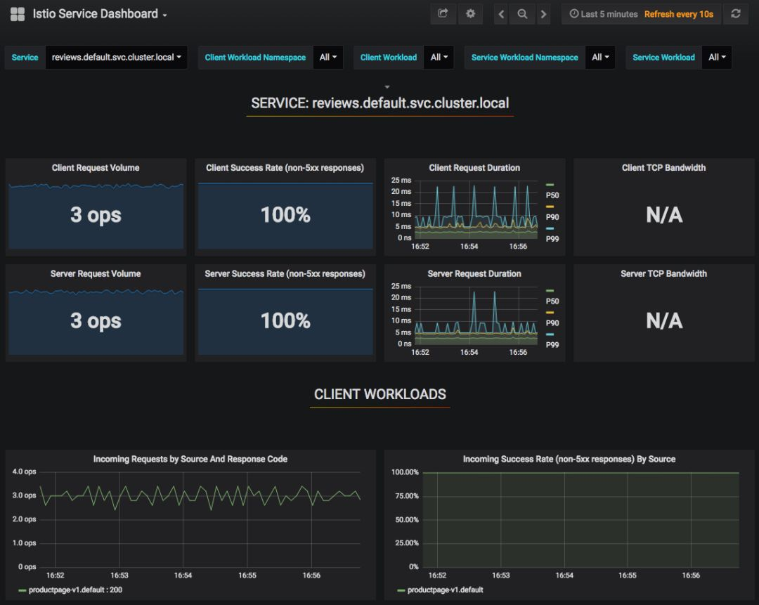 用你的浏览器访问:http://${GRAFANA_HOST}:3000/,选择其中一个面板,比如 Istio Service。通过此前应用的配置,我们限制了流量,仅显示版本1的reveiws应用。从服务的下拉菜单中选择 reviews.default.svc.cluster.local,就可以从图表中查看。现在使用以下命令从Rancher的kubectl生成一些流量: